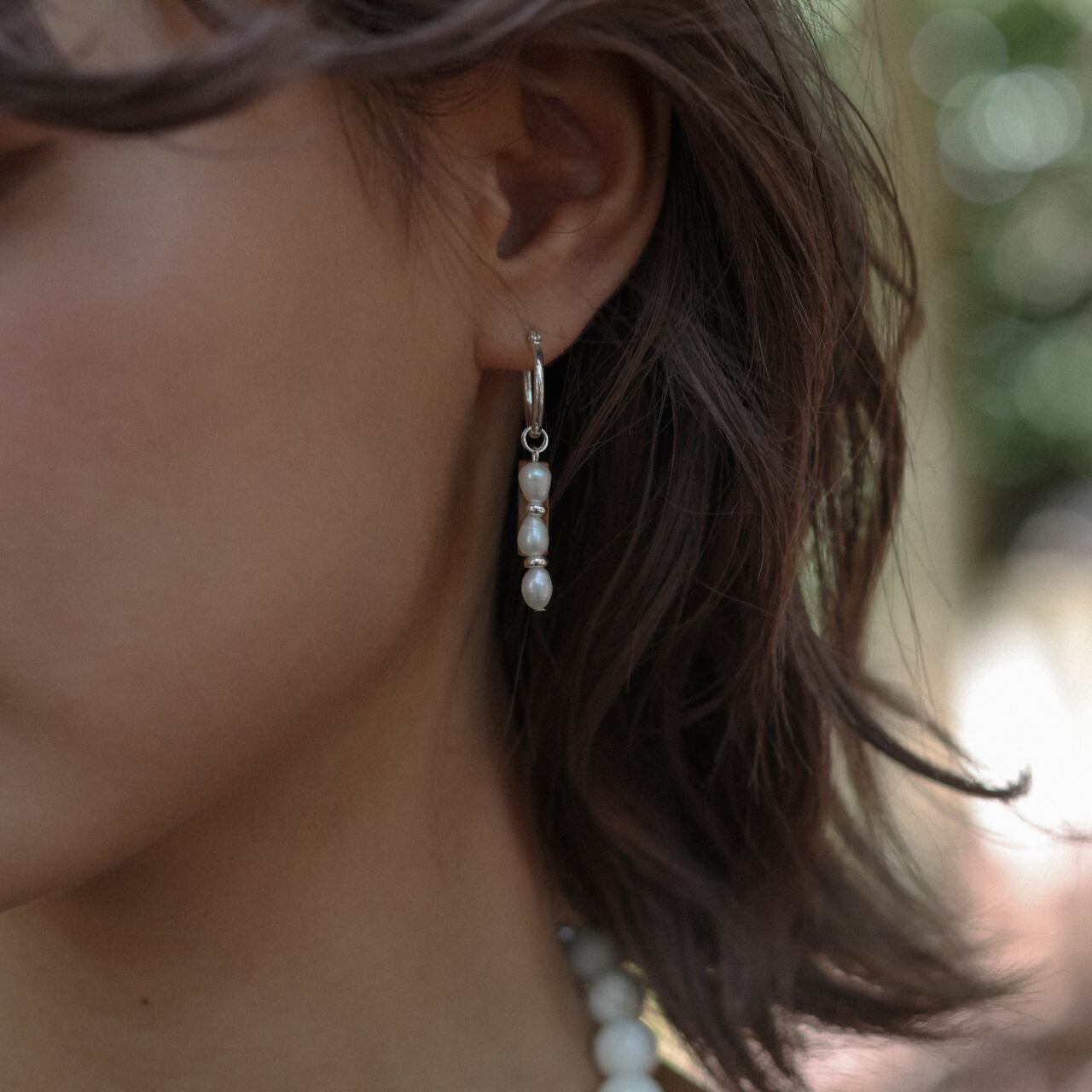 左右で異なるアシンメトリーデザインが、耳元にモードな抜け感を演出します。