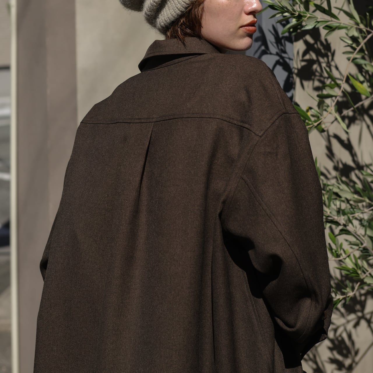 程よいハリと落ち感のあるポリエステル素材を使用した、オーバーサイズのシャツジャケット。