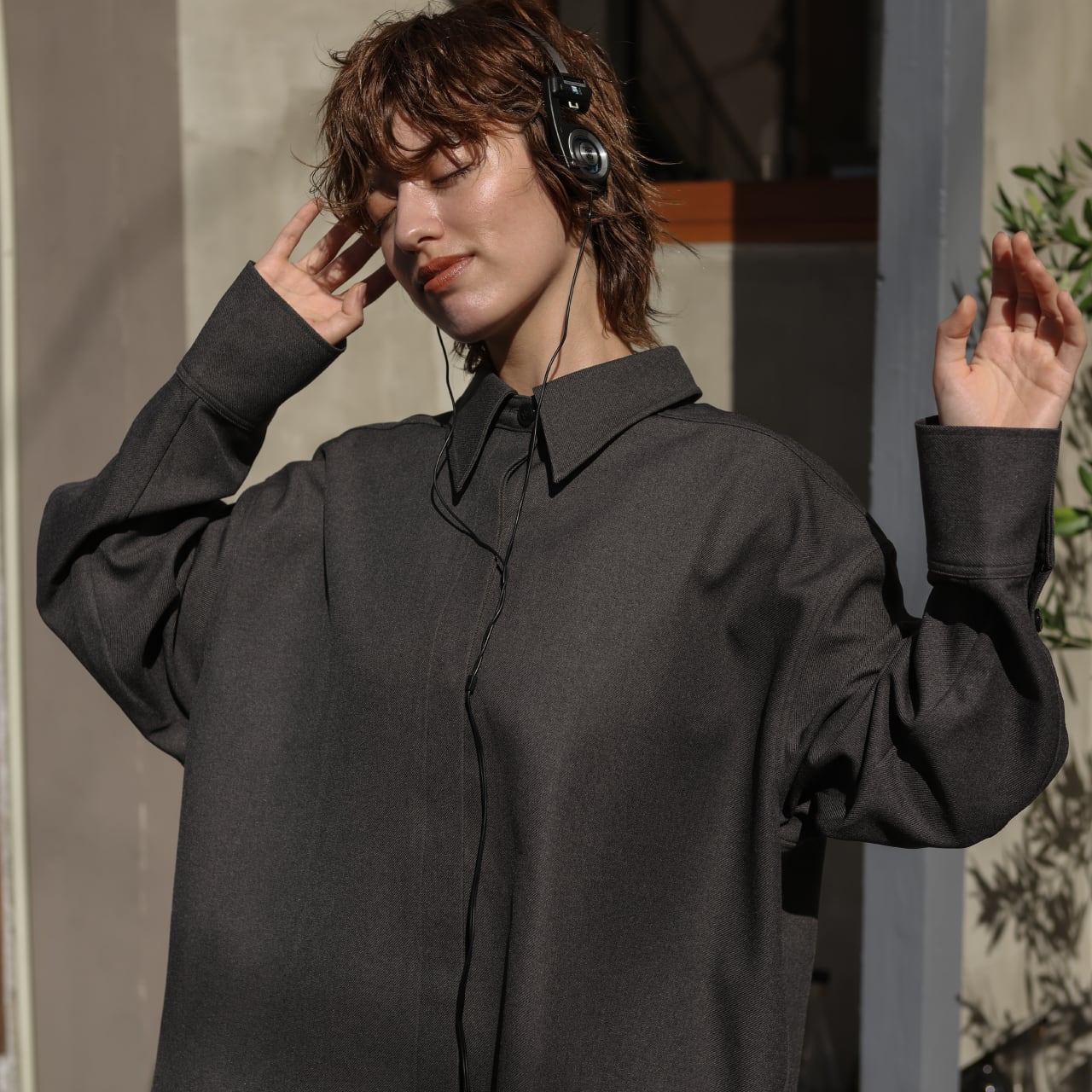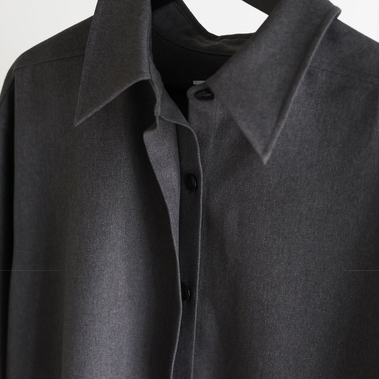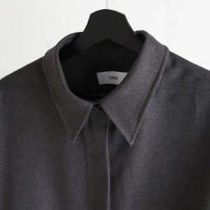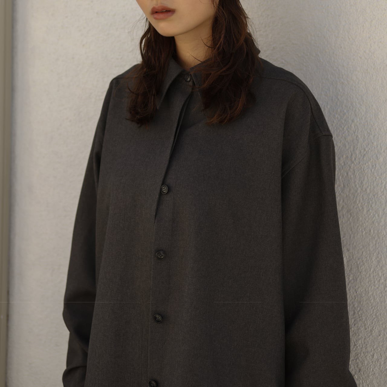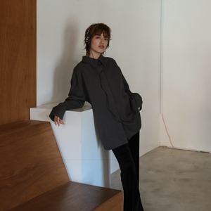 程よいハリと落ち感のあるポリエステル素材を使用した、オーバーサイズのシャツジャケット。