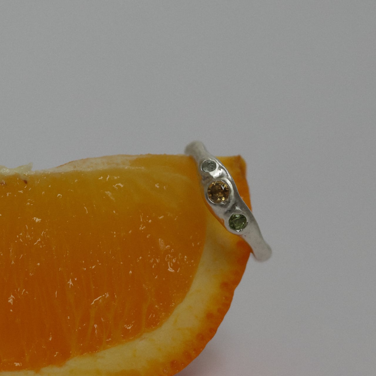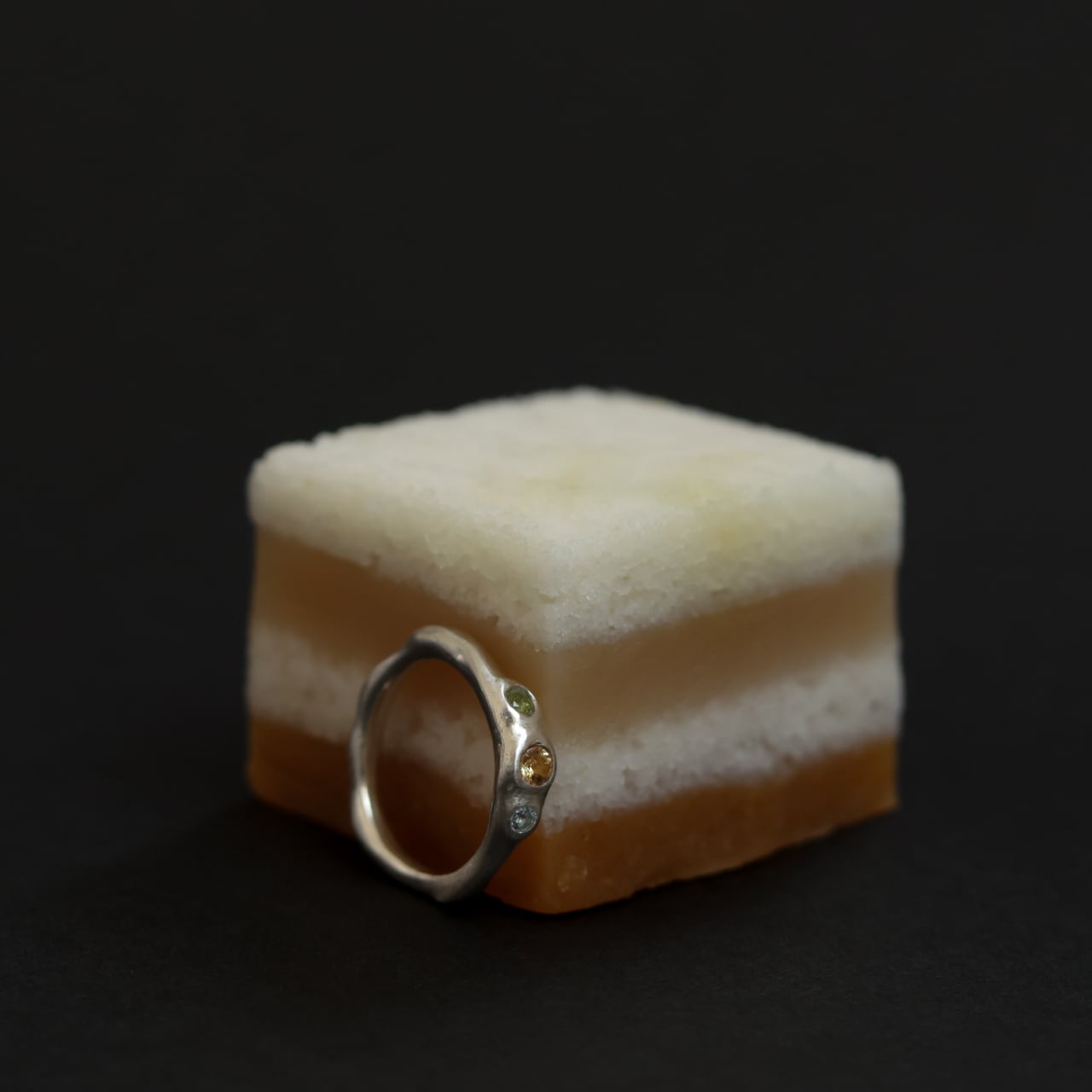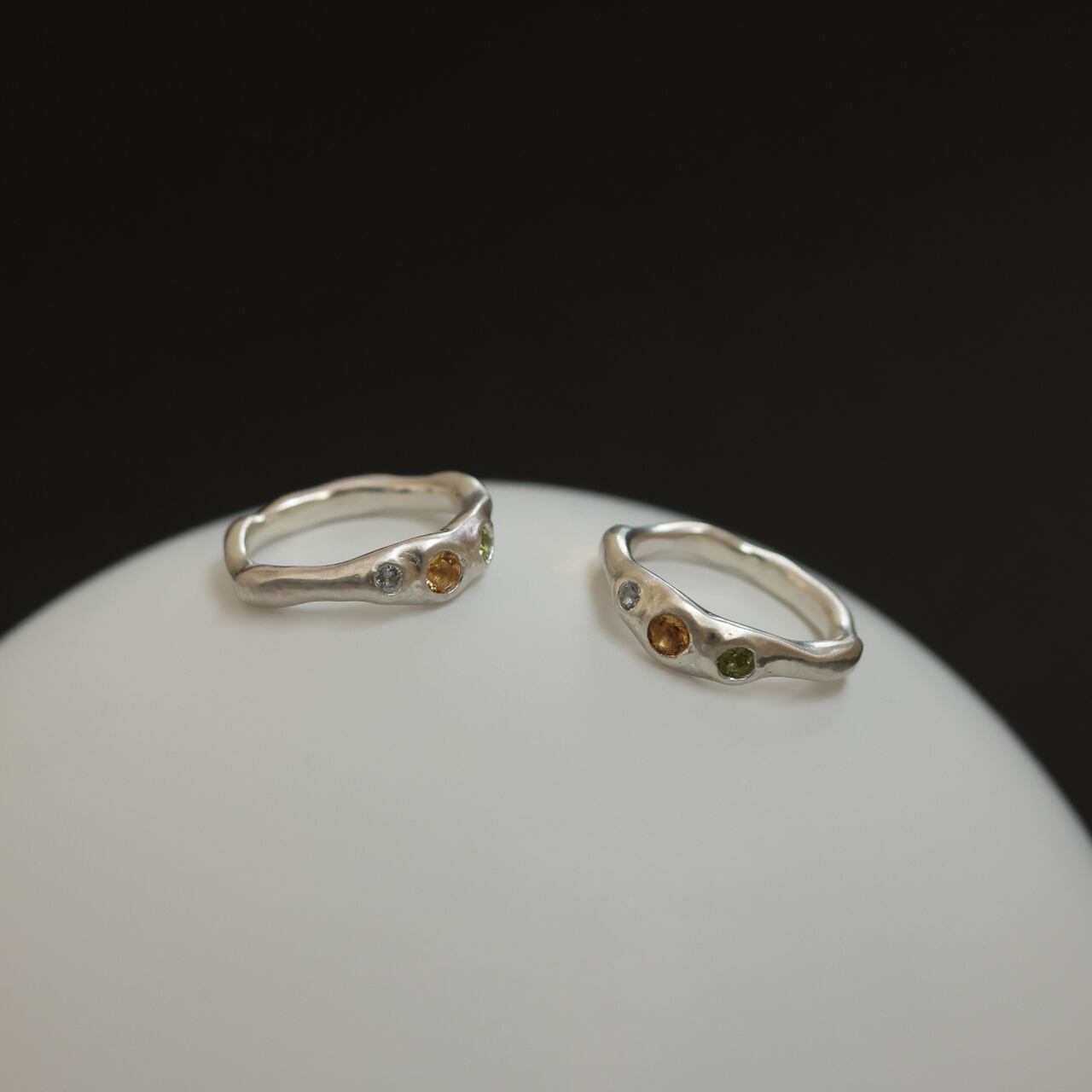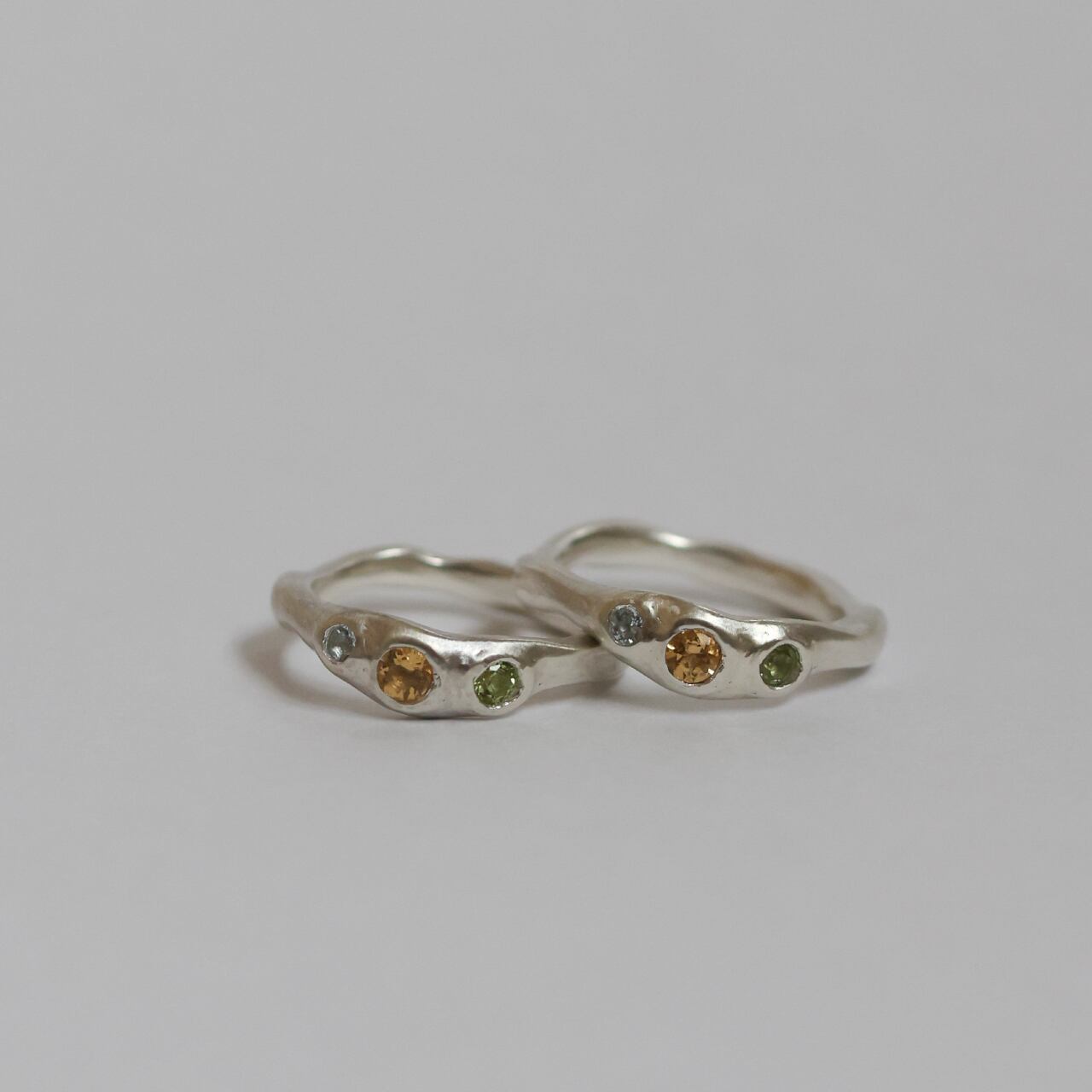 3つの石が程よい存在感を生み、重ね付けはもちろん、1本でも手元にさりげない華やかさを添えてくれます。